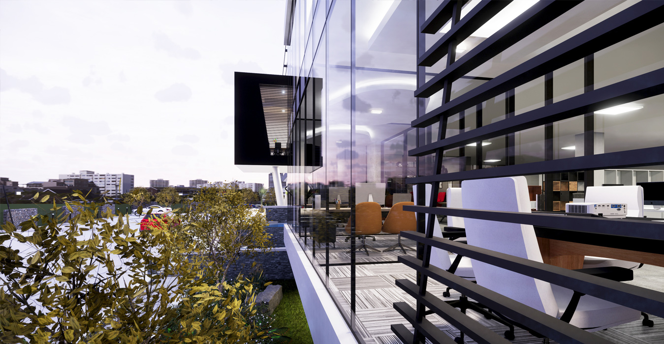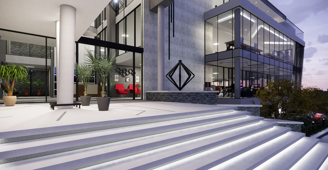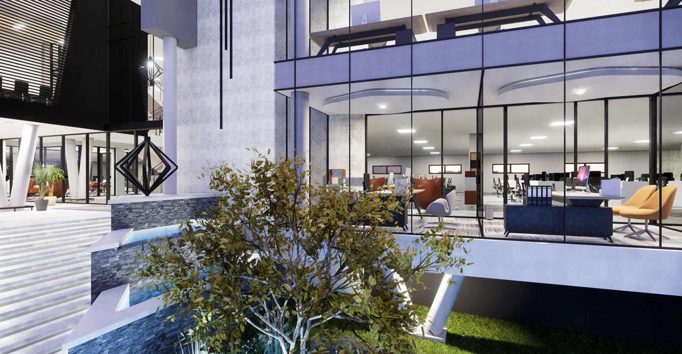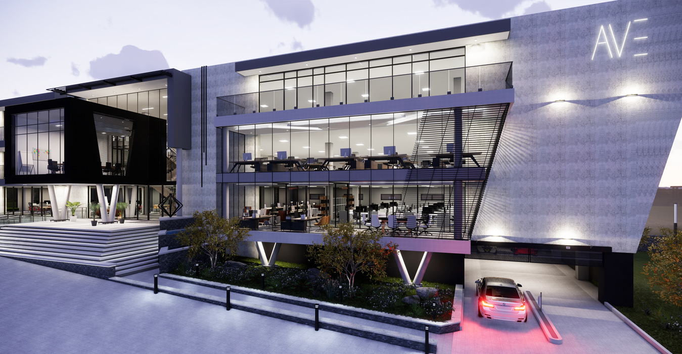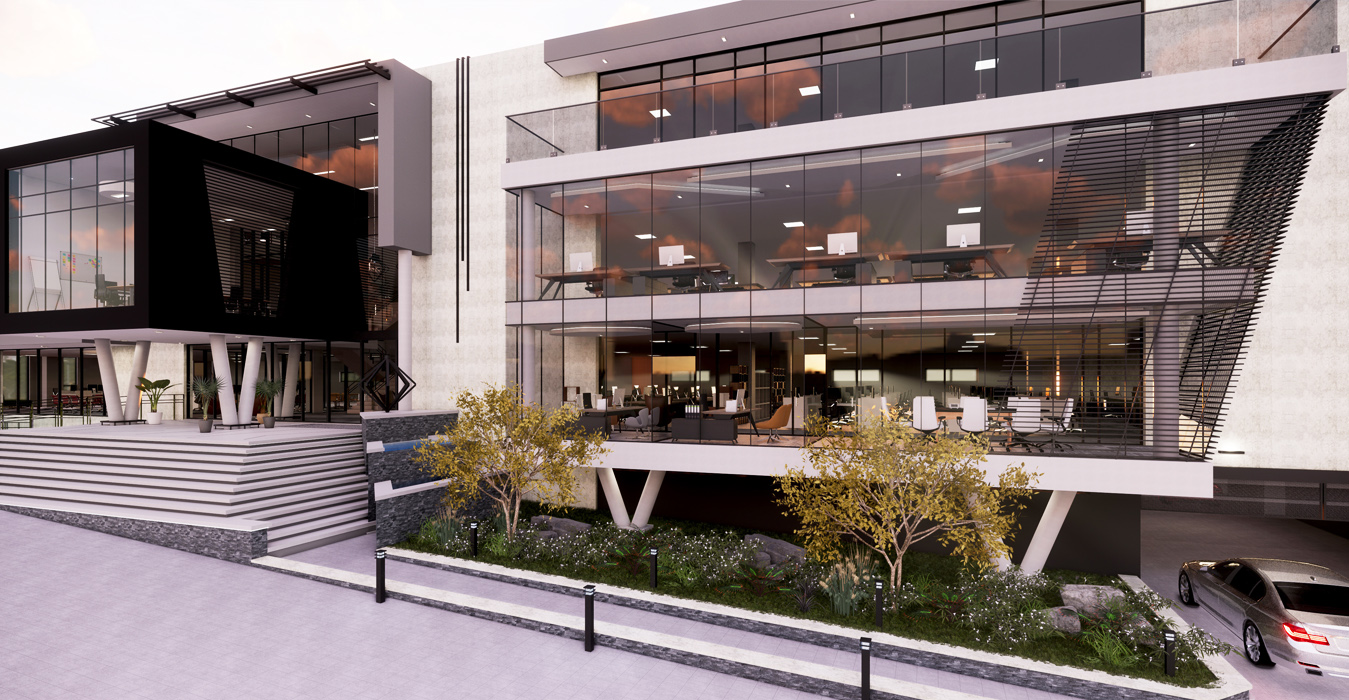 Diamond Walk PrecinctThis exciting landmark development comprises of 1 semi-basement parking and 3 office levels above ground with over 4500m² of Rentable Area. The design makes use of feature landscape berms and grand staircases complimenting the substantial slope across the site. With a commercially-minded approach, the building has been designed with flexibility in mind incorporating a unique and contemporary architecture. Ample natural light enters the atrium through the glass façade and natural landscaping is brought into the atrium with feature planters. Glass façades which are north facing have been designed in accordance to improve the thermal performance of the building, using a combination of single and double-glazing. With an objective to create a place that redefines the way we experience our work environment, the design promotes a pleasant and healthy environment encouraging interaction by the use of one vertical circulation and service core. The central concept of this development is based on an entirely new vision for the future of property development in South Africa.