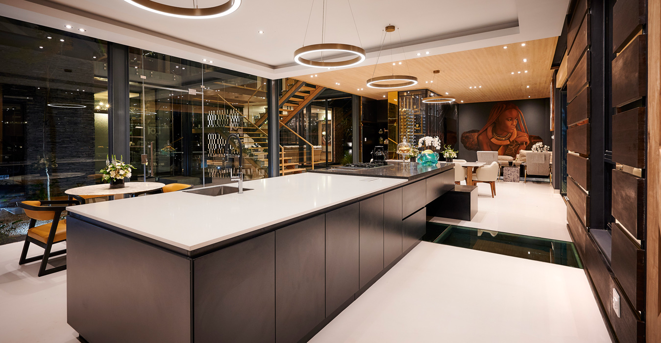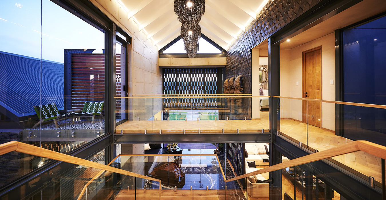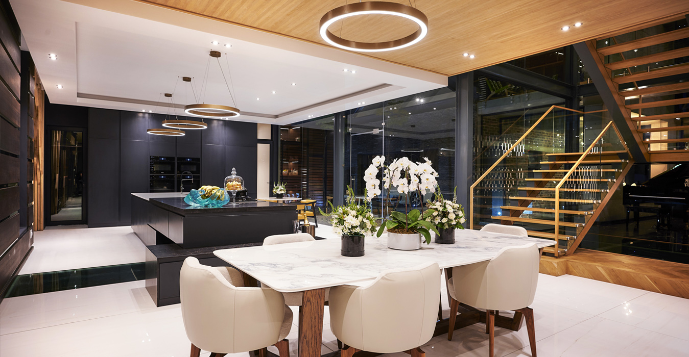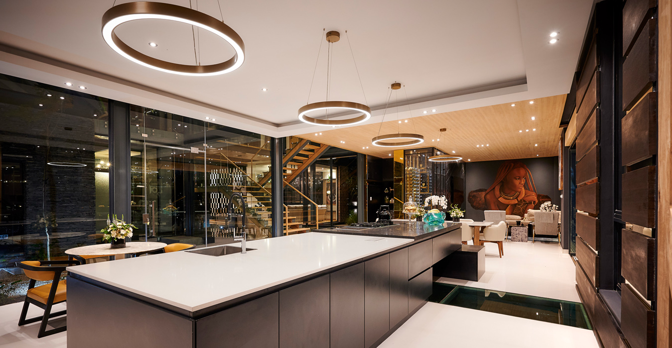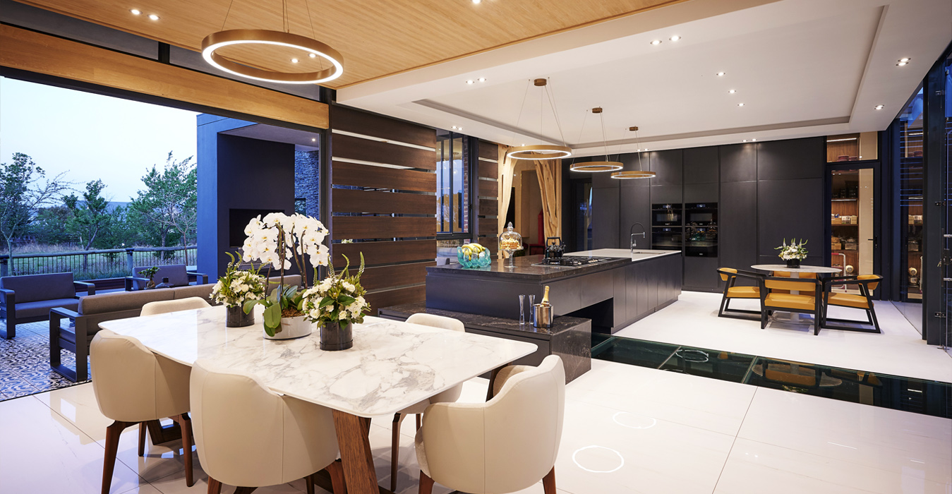 Southdowns EstateFeatured in the SA Home Owner Home and Décor Trends Special Edition 2020 magazine as one of the best designs in SA, this home provides panoramic views of the surrounding landscape that effectively promotes private spaces for family living. Situated in Southdowns Estate, the design captures a farm atmosphere resonating with the exclusive housing estate which is quiet and laid-back with a lot of open pastures where cows graze every morning. The house is filled with natural light providing a seamless indoor-outdoor living experience which serves as a catalyst for visual connection of indoor and outdoor spaces. With a mix of textures and natural elements, the architecture draws strength from the use of raw, rustic materials to capture a farm atmosphere with full-height glass panels to provide contrast. A peaceful and tranquil atmosphere is achieved by the inclusion of a stunning koi pond that runs throughout the house.